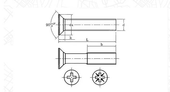 沉頭螺絲,又稱(chēng)作平機(jī)螺絲、平頭螺絲,其頭部,是一個(gè)90度的錐體,和常見(jiàn)的木螺絲類(lèi)似,頭部有工具擰緊槽,有一字形、十字形、內(nèi)六角形等。